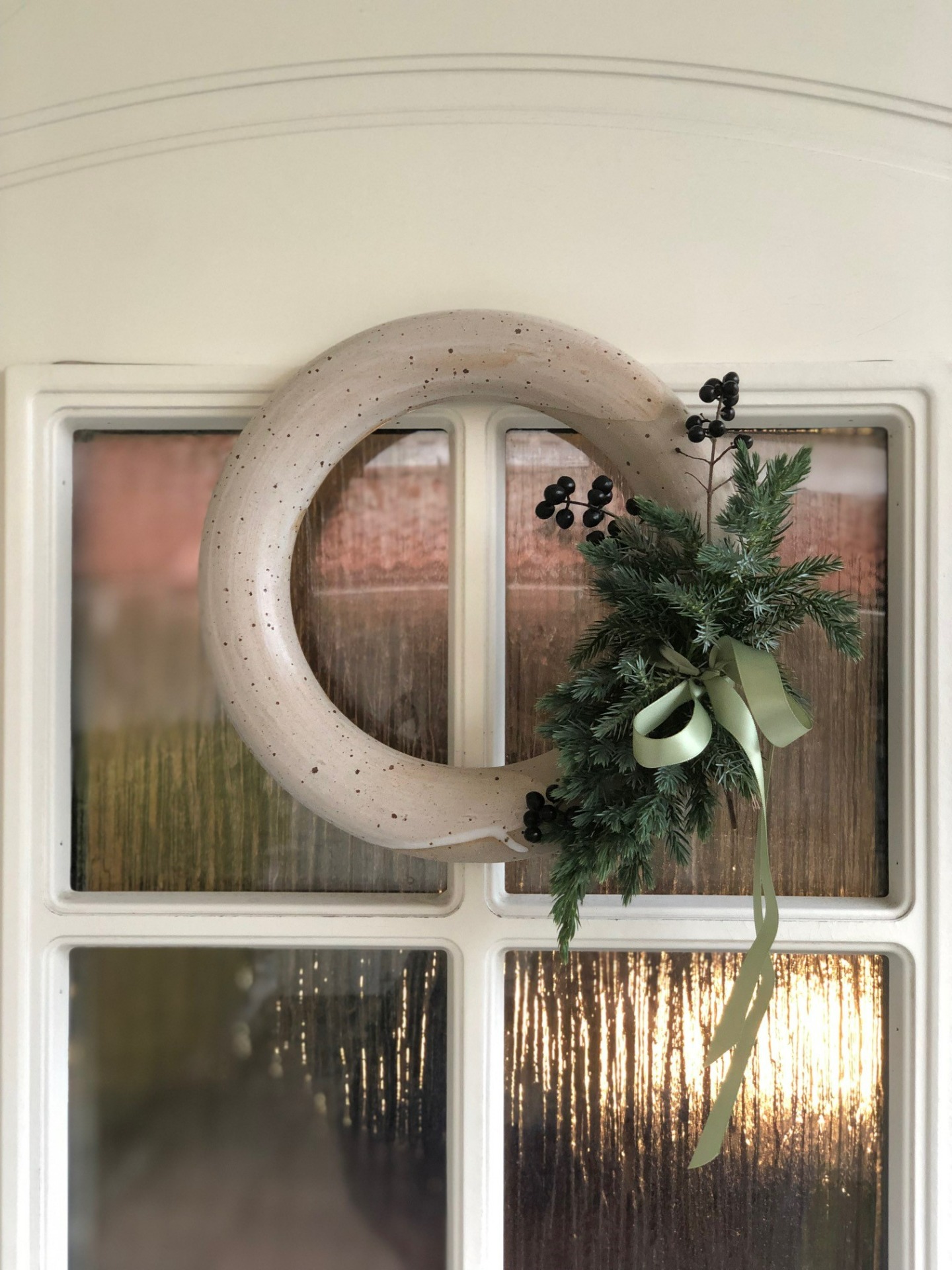 Keramisk dörrkrans i 100% återvunnen stengodslera med mattvit, halvtransparent glasyr. Kan enkelt dekoreras efter säsong, varieras i oändlighet och användas år efter år. B ca 26, H ca 26, D ca 4 cm.