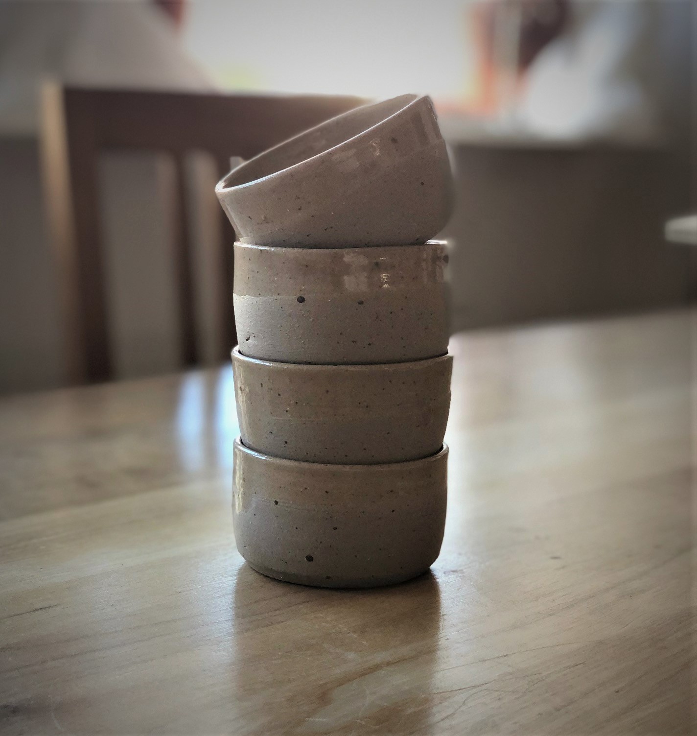 Kopp/skål i 100% återvunnen stengodslera, delglaserad i helklar glasyr. Tål värmeljus, micro och maskindisk. B ca 9, H ca 5 cm.